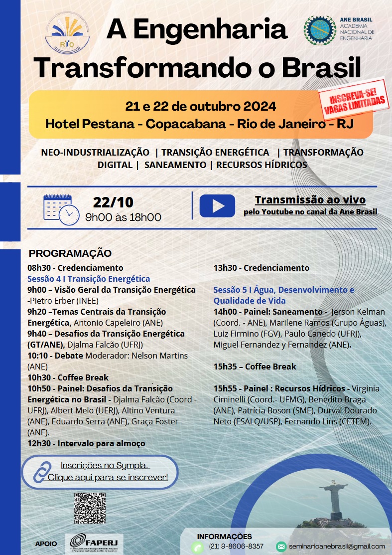A Academia Nacional de Engenharia (ANE) promove o Seminário "A Engenharia Transformando o Brasil", com apoio da FAPERJ, nos dias 21 e 22 de outubro.