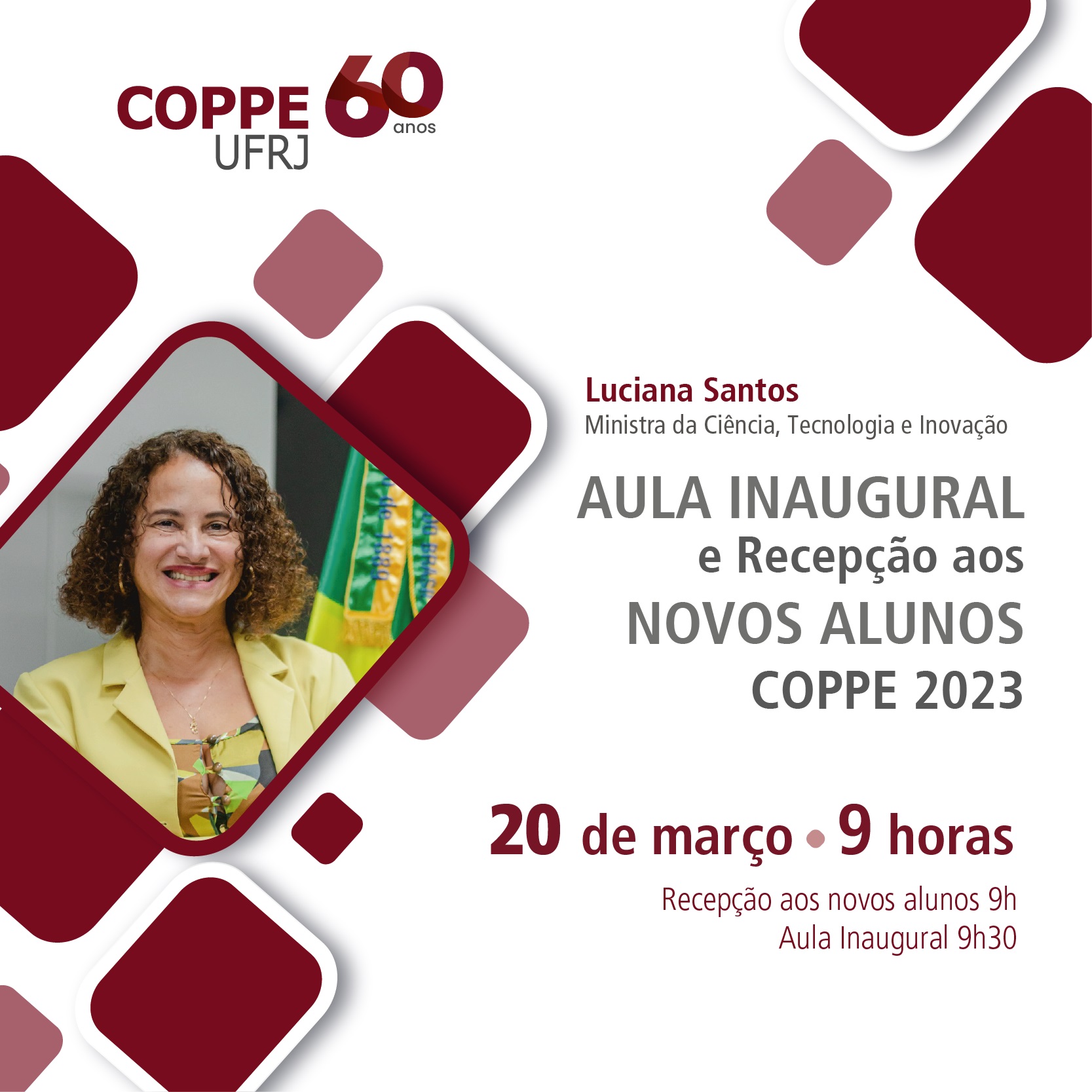 A Diretoria da Coppe/UFRJ convida seu corpo social para a cerimônia de Recepção aos Novos alunos e para sua Aula Inaugural, dia 20 de março, às 9h, a ser proferida pela Ministra da Ciência, Tecnologia e Inovação (MCTI), Luciana Santos. O evento será realizado no auditório da Coppe, no Centro de Tecnologia 2, Avenida Moniz Aragão, 360, bloco 1, Cidade Universitária.