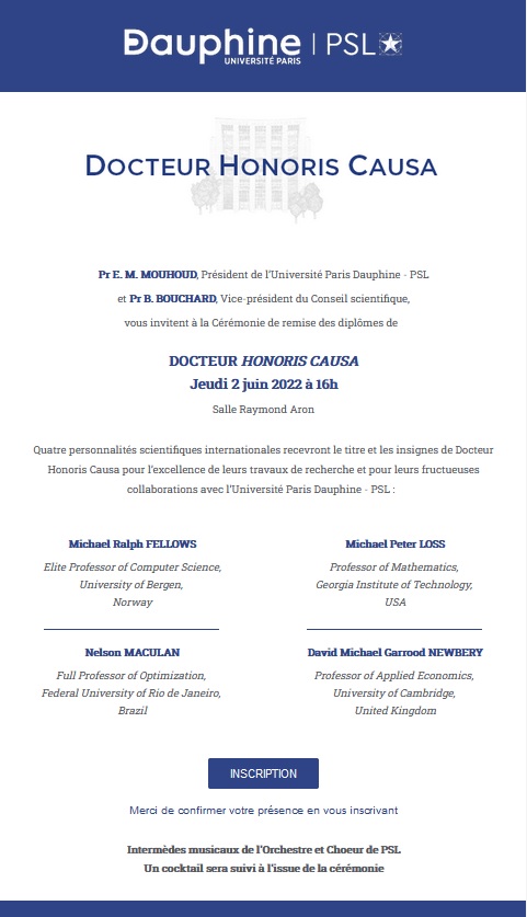 Outros três professores - Michael Ralph FELLOWS, da Universidade de Bergen; Michael Peter LOSS, do Instituto de Tecnologia da Geórgia; e David Michael Garrod NEWBERRY da University of Cambridge) - também receberam o Docteur Honoris Causa em cerimônia realizada no dia 2 de junho de 2022, às 16 horas, na Salle Raymond Aron, na Université Paris Dauphine - PSL. .