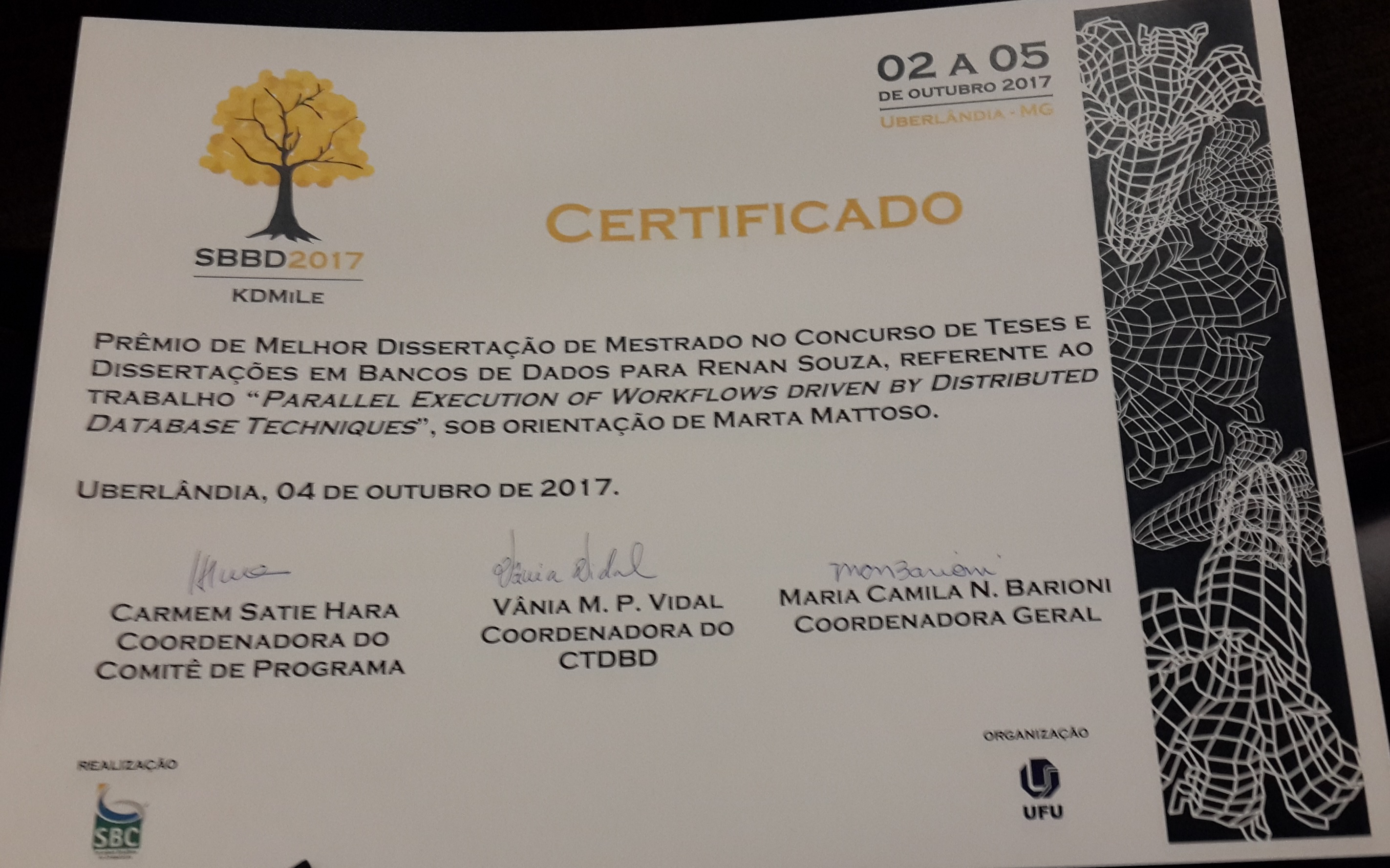 Renan Souza recebeu o Prêmio de Melhor Dissertação de Mestrado no Concurso de Teses e Dissertações em Bancos de Dados 2017 (CTDBD), durante o Simpósio Brasileiro de Bancos de Dados, realizado de 2 a 5 de outubro de 2017, em Uberlândia - MG.