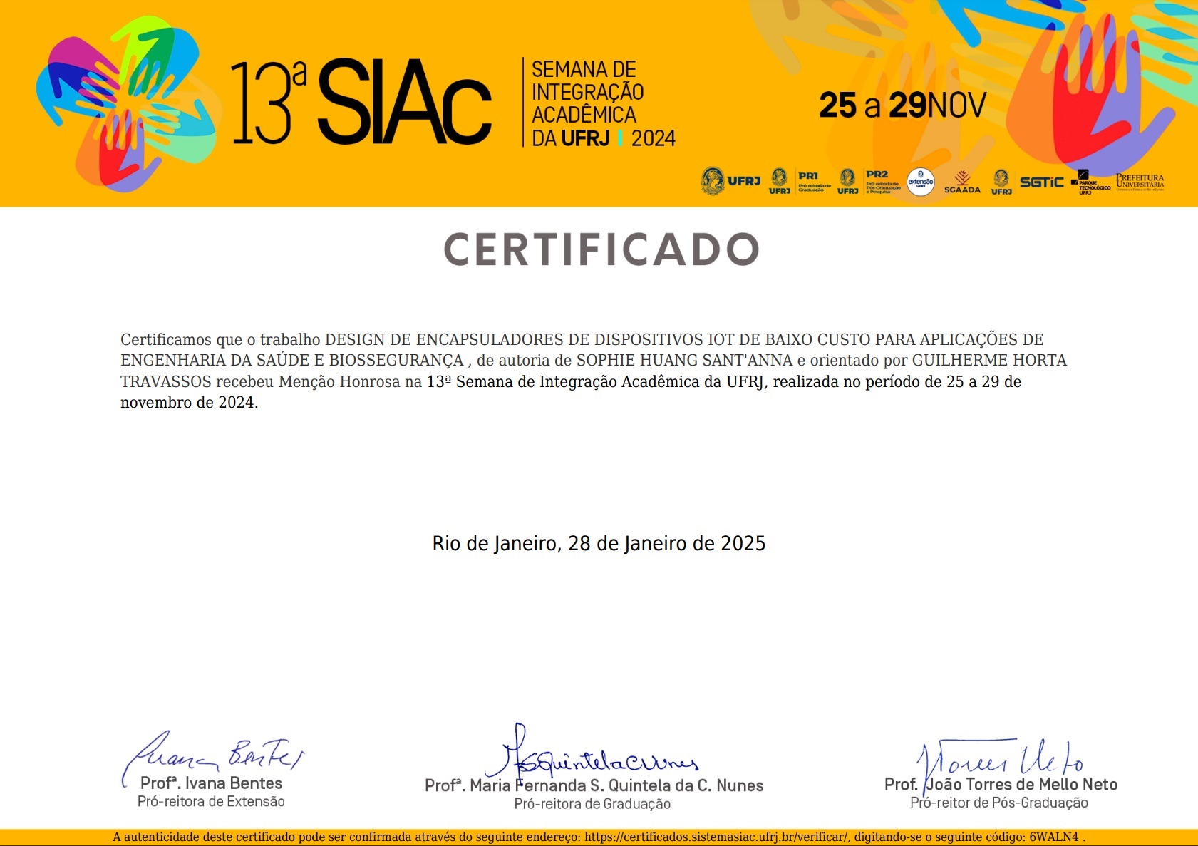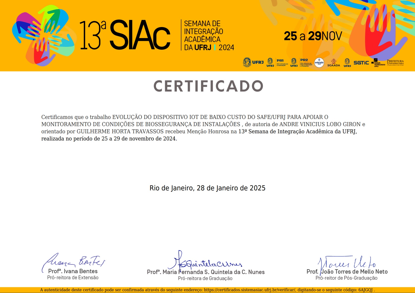Os trabalhos “Design de Encapsuladores de Dispositivos IoT de Baixo Custo para Aplicações de Engenharia da Saúde e Biossegurança” , executado por SOPHIE HUANG SANT'ANNA, aluna do curso de Design Industrial; e “Evolução do Dispositivo IoT de Baixo Custo do SAFE/UFRJ para Apoiar o Monitoramento de Condições de Biossegurança de Instalações”, executado por ANDRE VINICIUS LOBO GIRON, aluno do curso de Engenharia de Controle e Automação; receberam Menção Honrosa na 13ª Semana de Integração Acadêmica da UFRJ, realizada no período de 25 a 29 de novembro de 2024.