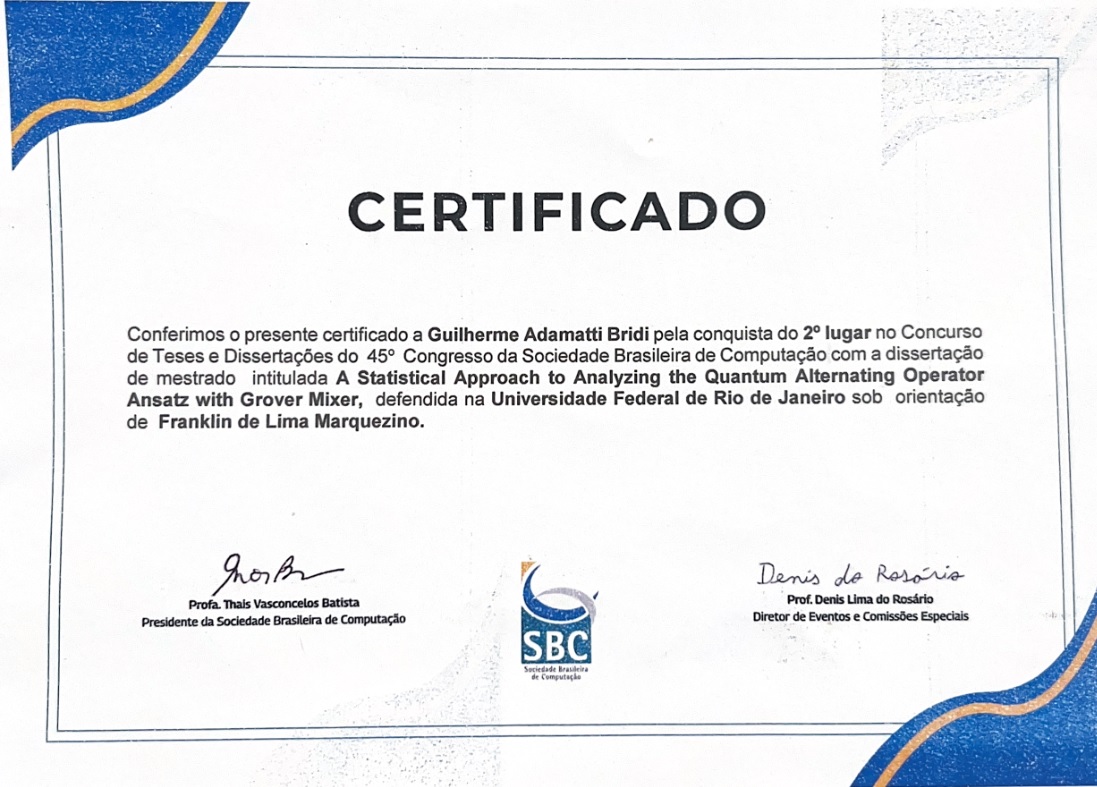 A Statistical Approach to Analyzing the Quantum Alternating Operator Ansatz with Grover Mixer" é o título da dissertação de mestrado de Guilherme Adamatti Bridi, orientada pelo Prof. Franklin de Lima Marquezino, que conquistou o 2º lugar no Concurso de Teses e Dissertações (CTD 2025) da Sociedade Brasileira de Computação (SBC). Veja a dissertação clicando aqui.