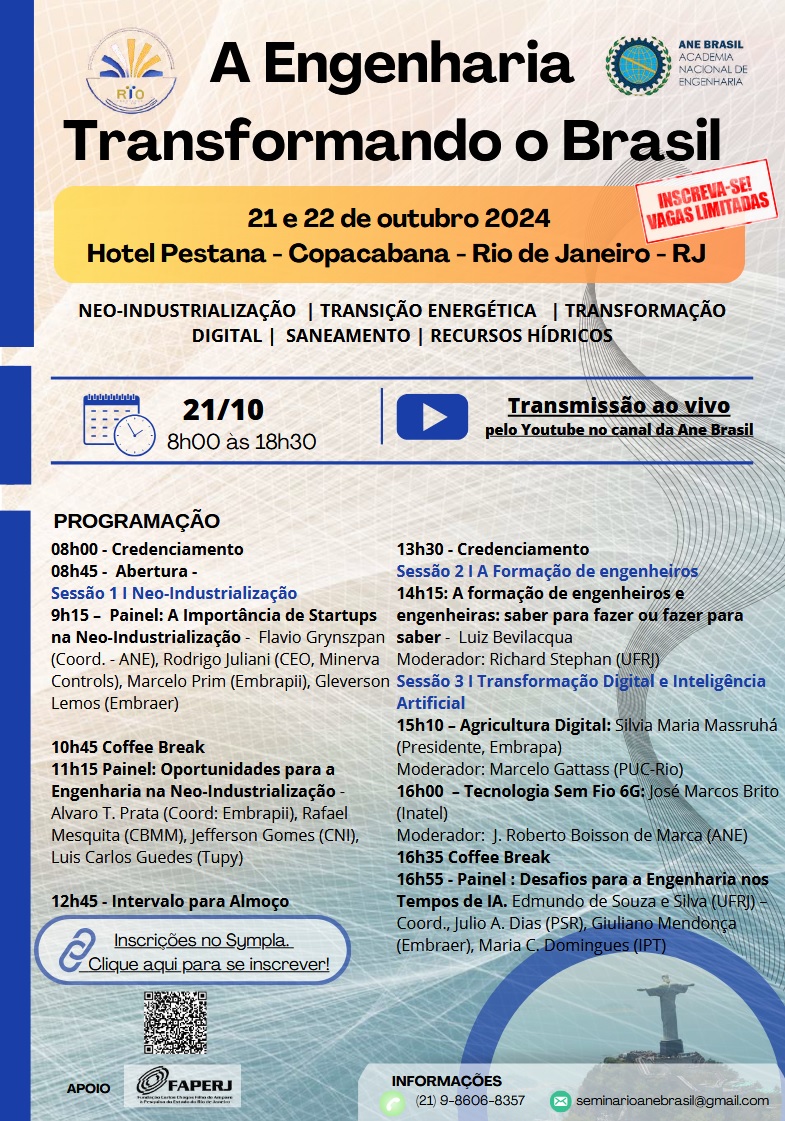 A Academia Nacional de Engenharia (ANE) promove o Seminário "A Engenharia Transformando o Brasil", com apoio da FAPERJ, nos dias 21 e 22 de outubro.