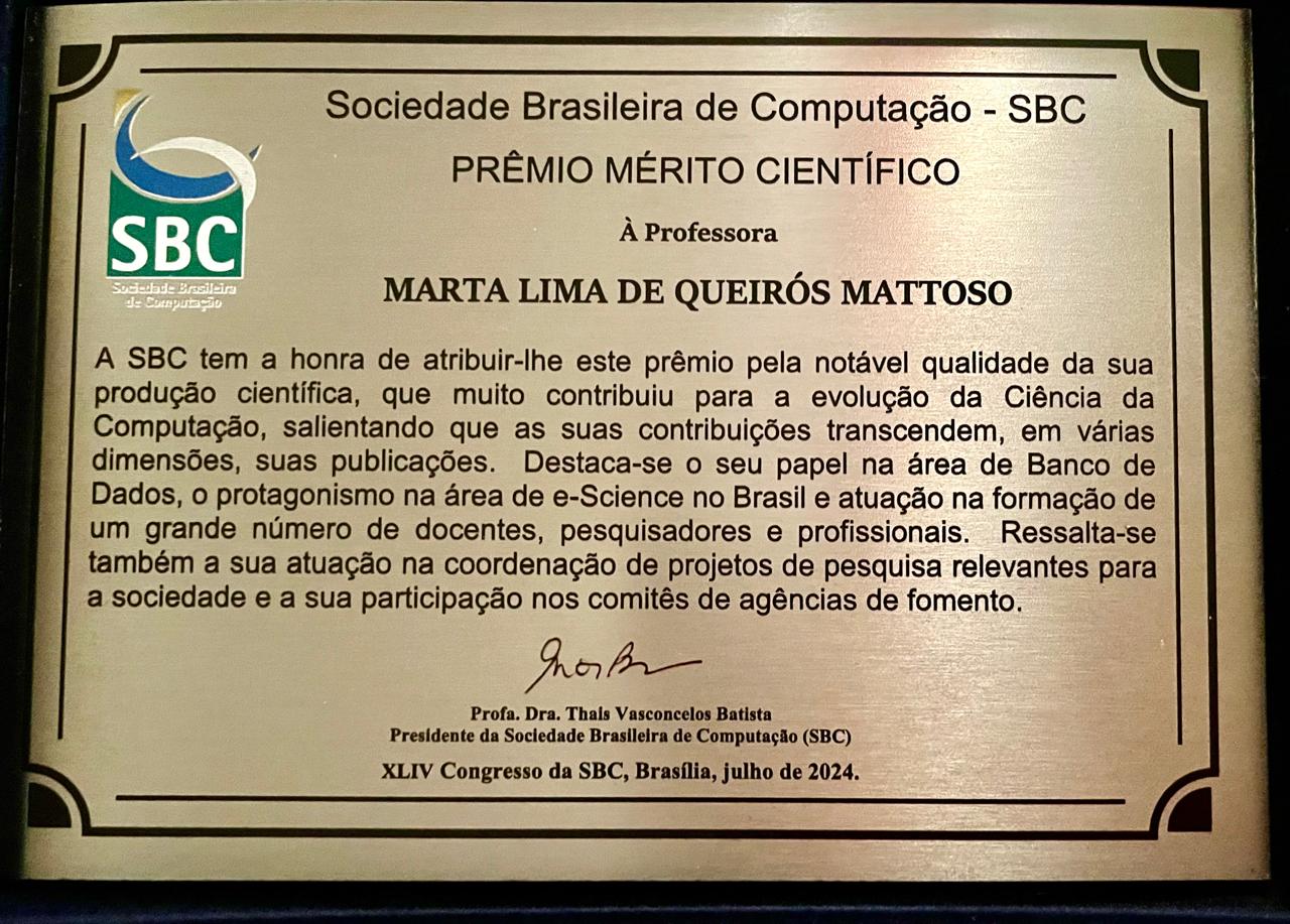 Além da Profa. Marta - que entra para o grupo dos 20 pesquisadores já agraciados pelo Mérito Científico da SBC - receberam esta distinção os professores do PESC Jayme Luiz Szwarcfiter (2005), Nelson Maculan Filho (2010) e Edmundo Albuquerque de Souza e Silva (2023).