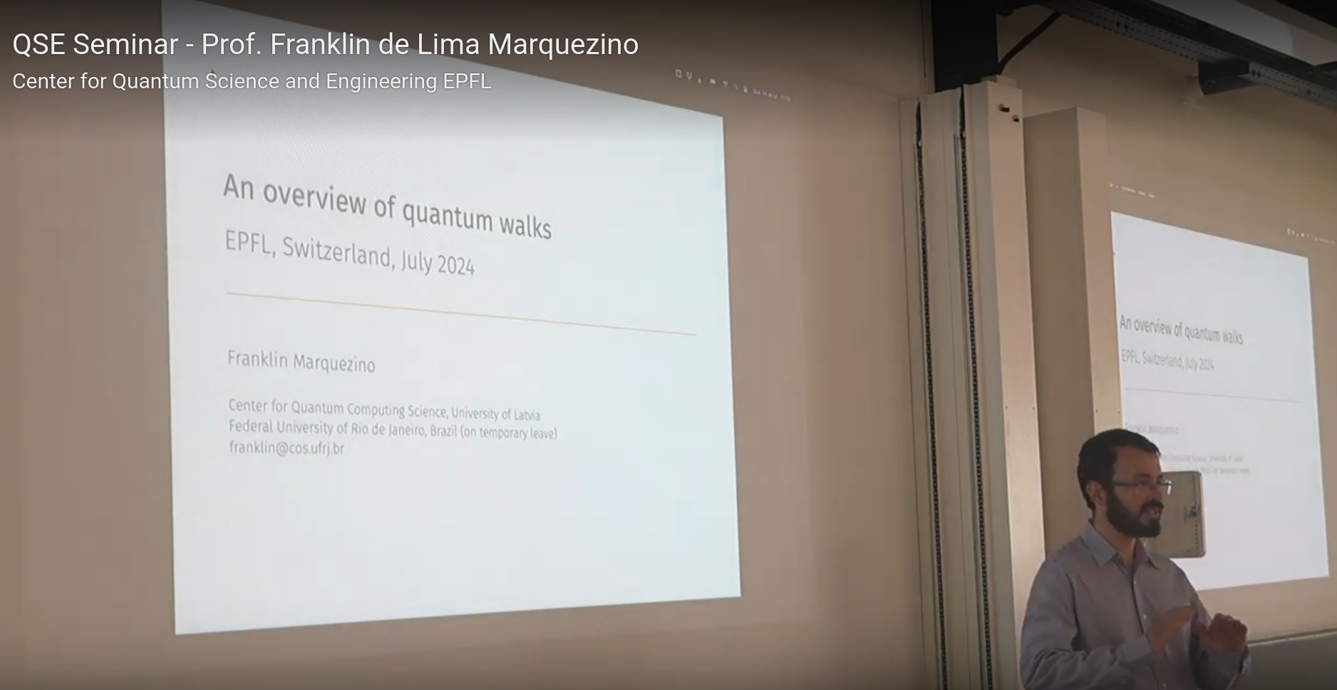 O Prof. Franklin Lima Marquezino (PESC) visitou a École Polytechnique Fédérale de Lausanne (EPFL), Suíça, no dia 24 de julho e proferiu palestra no ciclo de seminários do Centro de Ciência e Engenharia Quântica (QSE Center). A palestra intitulada "An overview of quantum walks" foi a primeira de duas palestras do seminário que atraiu mais de 50 participantes, entre alunos e professores de diferentes departamentos.
