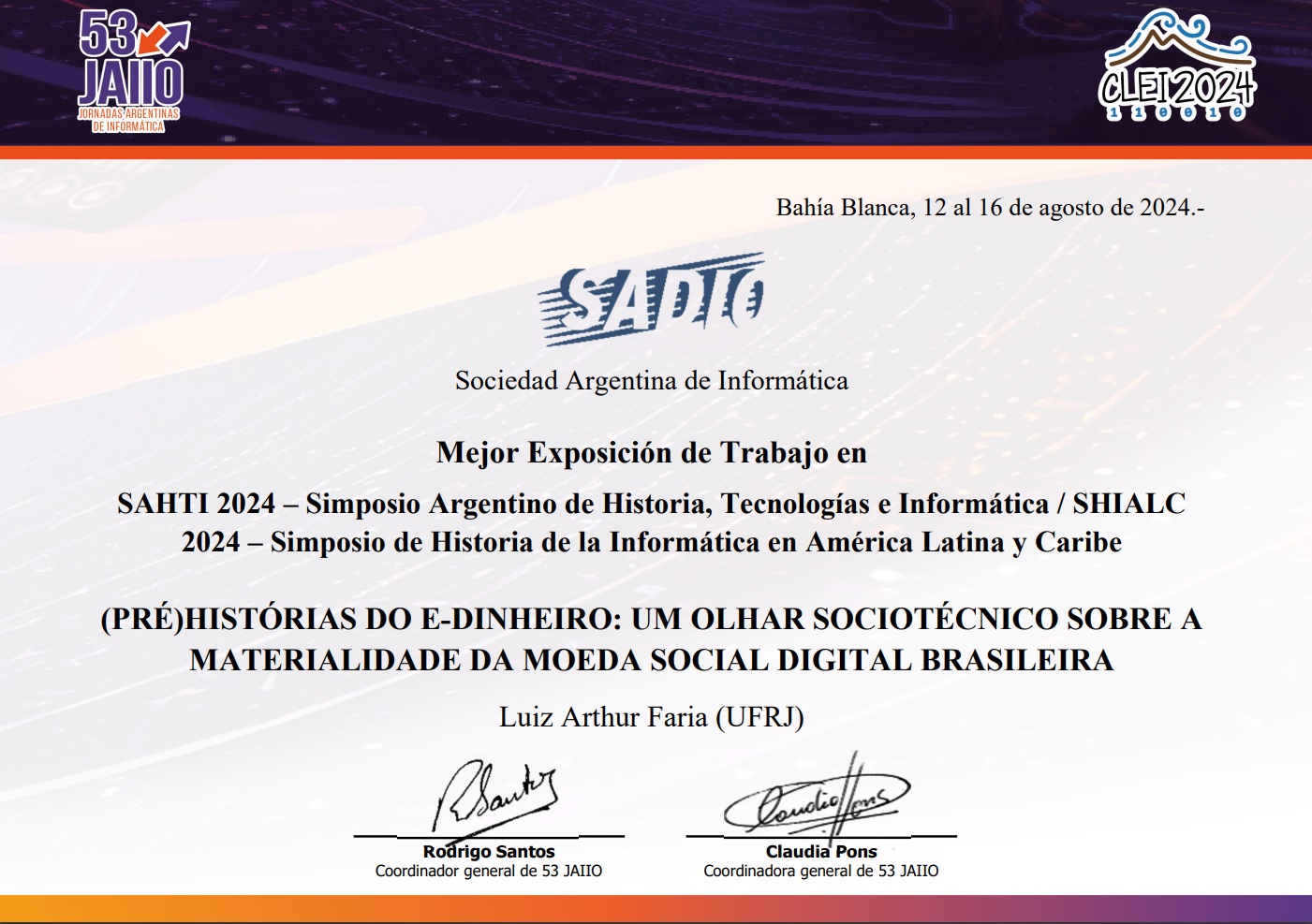 Já o artigo "(Pré)Histórias do E-dinheiro: um olhar sociotécnico sobre a materialidade da moeda social digital brasileira" foi exposto pelo professor Luiz Arthur Silva de Faria, cuja apresentação foi premiada pela Sociedad Argentina de Informática como a melhor exposição de trabalho do evento.