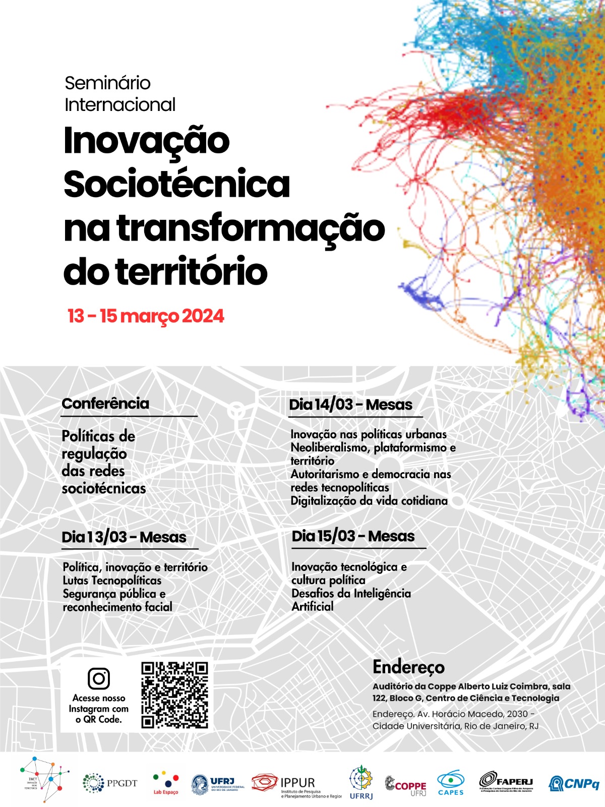 De 13 a 15 de março de 2024 ocorrerá o “Seminário Internacional Inovação Sociotécnica na Transformação do Território”, no Auditório da COPPE/UFRJ (Sala G-122, Centro de Tecnologia, Fundão). O seminário é coordenado pelos Profs. Nelson Maculan, Aldenilson Costa, Tamara Tania Cohen Egler e Lolita Kraus.