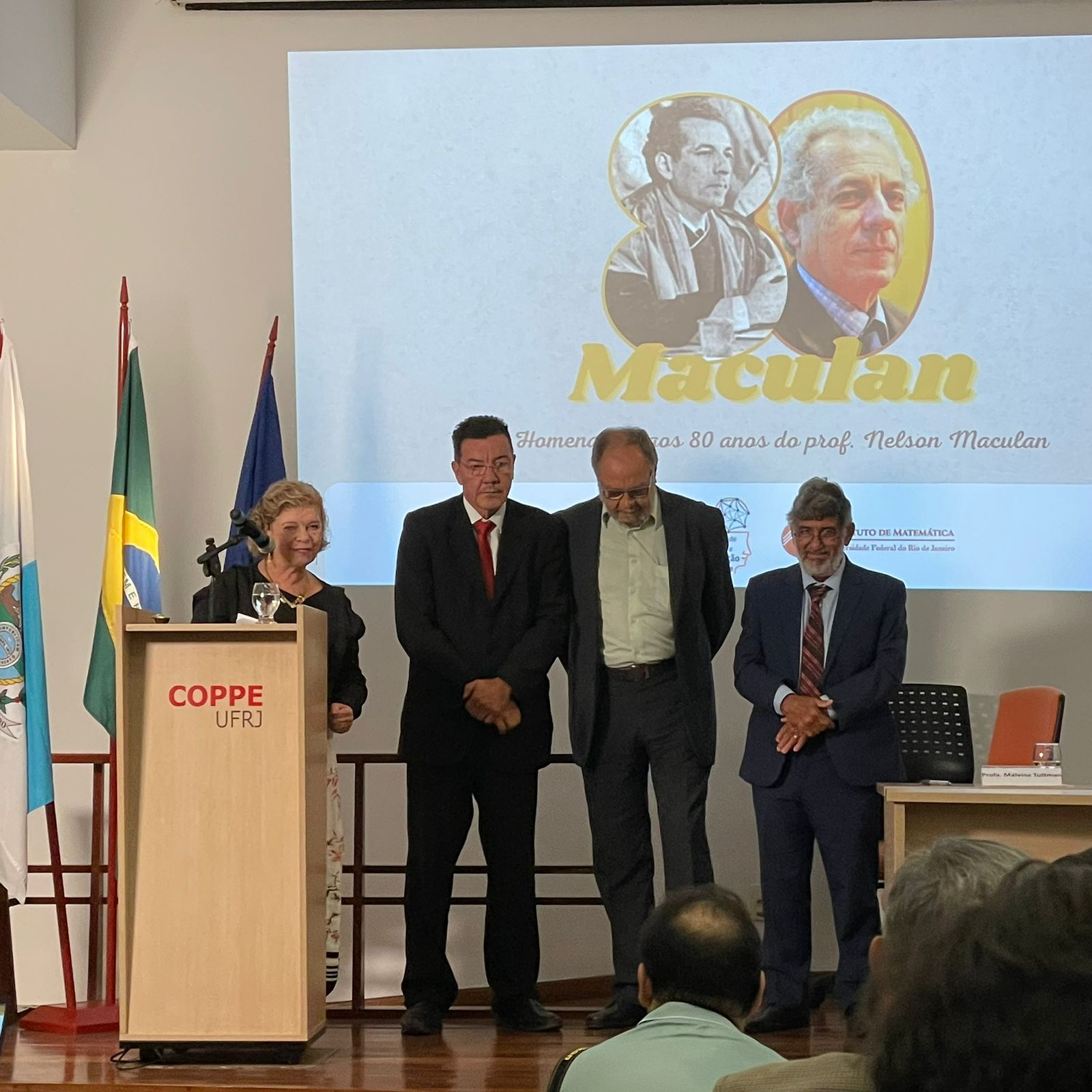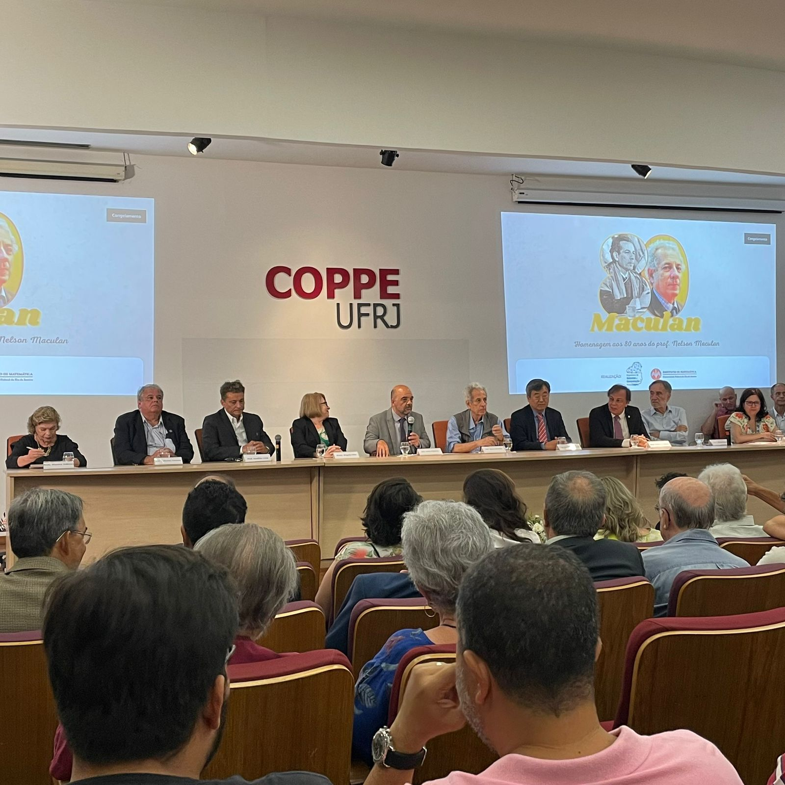 A mesa foi composta por diversas autoridades da UFRJ e como palestrantes tivemos seus orientados no PESC: o professor Marcone Souza, ex-reitor da UFOP, onde o homenageado se graduou; a professora Lorena Pradenas, da Universidade de Concepción no Chile; o professor Carlile Lavor, da UNICAMP, co-autor mais frequente do homenageado; o professor Luidi Gelabert Simonetti do PESC/COPPE/UFRJ e os professores Victor Giraldo e Gregório Malajovich, do Instituto de Matemática da UFRJ.